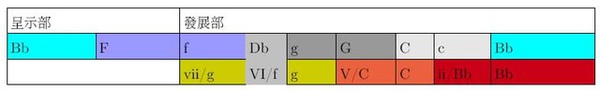 這是一首降B大調的曲子,呈示部中由降B大調向F大調(屬調)前進,而在發展部中經過了f小調、降D大調、g小調、C大調,再回到降B大調的再現部。我們先從呈示部談起: